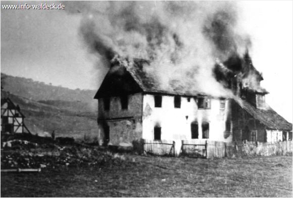 Als die Stollmühle Ihren Dienst zur Stromerzeugung beim Bau der Edertalsperre geleistet hatte und das Staubecken nun erstmalig geflutet werden sollte, wurde die Stollmühle abgebrannt. Das Bild zeigt die brennende Stollmühle.
