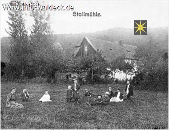 Am hinteren Teil des Hopfenberges, der heutigen Edertalsperre zugeneigt, lag einst die Stollmühle. Den Namen hat sie von dem, von zwei strafgefangenen Bergleuten, die im Gefängnis von Schloß Waldeck einsaßen, in den Berg gehauenen Stollen, der das Wasser von der jenseitigen Eder, die den Hopfenberg umfloss, zu dem ehemaligen Vornhagener Hammerwerk am Hopfenberg leitete. Für den Bau des Stollens sollen die beiden Strafgefangenen ihre Freiheit bekommen haben. Das Hammerwerk stellte 1819 seinen Betrieb ein und so war ab da die Stollmühle alleinige Nutznießerin des Stollgrabens. Der Müller betrieb neben dem Auftragsmahlen auch den Transport der fertigen Ware, wofür er sich einen Bestand an Eseln hielt. War das Wasser der Eder zu hoch, um die Esel samt Ladung durch die Eder zu führen, dann wurde ein größerer Lastkahn in Betrieb genommen, der die Ladung und die Esel über die Eder brachte. Erst mit dem Bau um die Jahrhundertwende (1900) der festen Brücken bei Hemfurth und Berich, wurde der Transport der Ware, vor allen Dingen zu Zeiten von Hochwasser oder Eisgang, einfacher. Aber da nahte auch schon der Untergang - im wahrsten Sinn des Wortes.