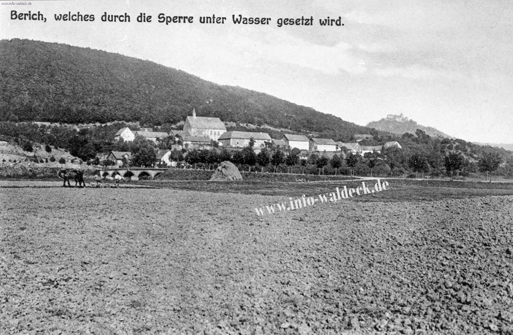 Insgesamt mussten im Staugebiet der Eder 3 Ortschaften komplett dem Wasser weichen. Während Bringhausen und Asel unweit der alten Dörfer neu entstanden, so entschieden sich 9 der größten bäuerlichen Betriebe, einige Handwerker und ein Gastwirt - diese Familien stammten aus Berich und aus Bringhausen - für den Umzug auf das ca. 40 km entfernt liegende Gut Büllinghausen in der Nähe von Arolsen. Die Umsiedlung dieser 17 vorwiegend Alt-Bericher Familien stellte die größte Herausforderung bei den Umsiedlingsmaßnahmen dar, zumal auch die alte Klosterkirche um 2 Joche verkürzt und wegen der geänderten Proportionen etwas niedriger im neuen Dorf wiedererrichtet werden sollte.
