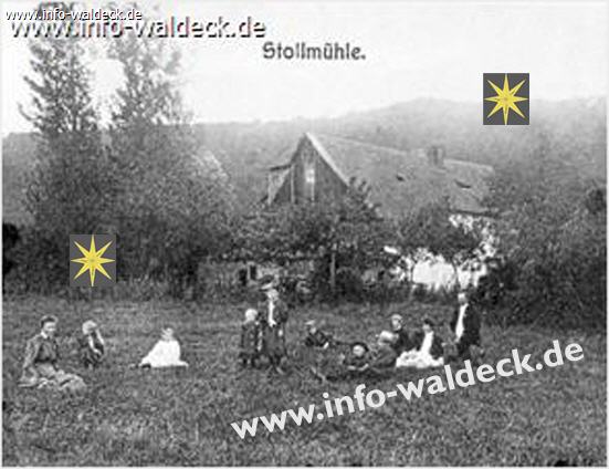 Am hinteren Teil des Hopfenberges, der heutigen Edertalsperre zugeneigt, lag einst die Stollmühle. Den Namen hat sie von dem, von zwei strafgefangenen Bergleuten, die im Gefängnis von Schloß Waldeck einsaßen, in den Berg gehauenen Stollen, der das Wasser von der jenseitigen Eder, die den Hopfenberg umfloss, zu dem ehemaligen Vornhagener Hammerwerk am Hopfenberg leitete. Für den Bau des Stollens sollen die beiden Strafgefangenen ihre Freiheit bekommen haben. Das Hammerwerk stellte 1819 seinen Betrieb ein und so war ab da die Stollmühle alleinige Nutznießerin des Stollgrabens. Der Müller betrieb neben dem Auftragsmahlen auch den Transport der fertigen Ware, wofür er sich einen Bestand an Eseln hielt. War das Wasser der Eder zu hoch, um die Esel samt Ladung durch die Eder zu führen, dann wurde ein größerer Lastkahn in Betrieb genommen, der die Ladung und die Esel über die Eder brachte. Erst mit dem Bau um die Jahrhundertwende (1900) der festen Brücken bei Hemfurth und Berich, wurde der Transport der Ware, vor allen Dingen zu Zeiten von Hochwasser oder Eisgang, einfacher. Aber da nahte auch schon der Untergang - im wahrsten Sinn des Wortes.