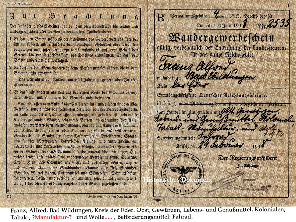 Als infolge des Krieges immer mehr Kriegsflüchtlinge nach Bad Wildungen kamen, wovon viele auch in der Altstadt zunächst eine Bleibe fanden und später außerhalb des Stadtkerns in Siedlungshäusern zogen, führte Alfred Franz einen Lieferdienst für seine Lebensmittel und Textilien ein. Jeden Donnerstag fuhr er und später sein Sohn Kurt zu seinen Kunden und holte dort Bestellungen, die die Kunden in Bestellhefte eingetragen hatten (z.B. Bestellheft Fam. Klüter), ab. Diese Bestellungen wurden dann bis zum Freitagnachmittag zusammengestellt und in einen Karton je Bestellung gepackt. Es wurde eine Rechnung beigelegt und das evtl. notwendige Wechselgeld in einen Lederbeutel bereitgestellt. Dann wurde gegen Geschäftsschluss am Freitag der Geschäftswagen mit den Warenkartons für die einzelnen Touren gepackt und die Waren ausgeliefert. Dies konnten bis zu 4 Touren sein.