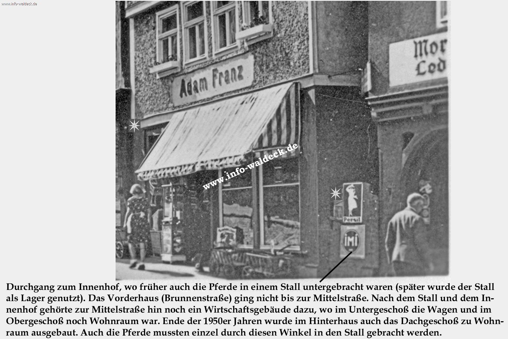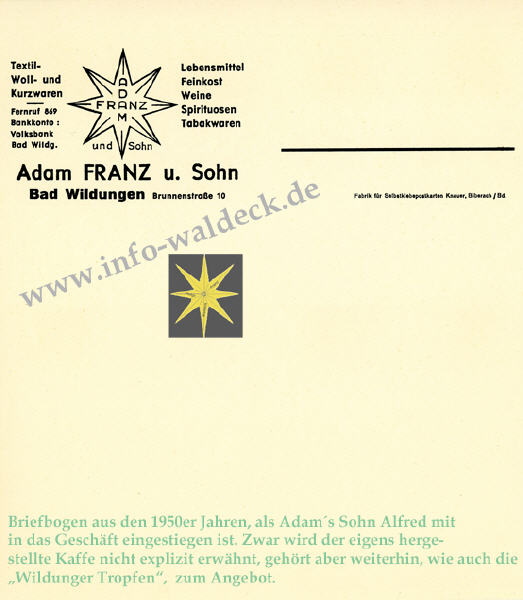 Zunächst verdiente sich Adams und Elises 3. Sohn Alfred seinen Unterhalt mit einem Wandergewerbe, indem er mit einem Fahrrad im Eder- und Wesetal bestimmte Waren verkaufte. Nach dem 2. Weltkrieg stieg er dann in das Geschäft seines Vaters ein. Ab da firmierte der Kolonialwarenladen unter "Adam Franz & Sohn". Diese Firmierung blieb auch nach dem Tod von Adam Franz in 1952 und Alfred Fanz in 1963 bis 1969 bestehen. In 1968/69 baute Luise Franz zusammen mit ihrem 2. Sohn Peter Franz im der Wildunger Flur Bubenhausen am Taubenrain ein Wohnhaus mit einem vorgelagerten Lebensmittelladen. Ab da lautetet die Firmierung "Luise & Peter Franz".
